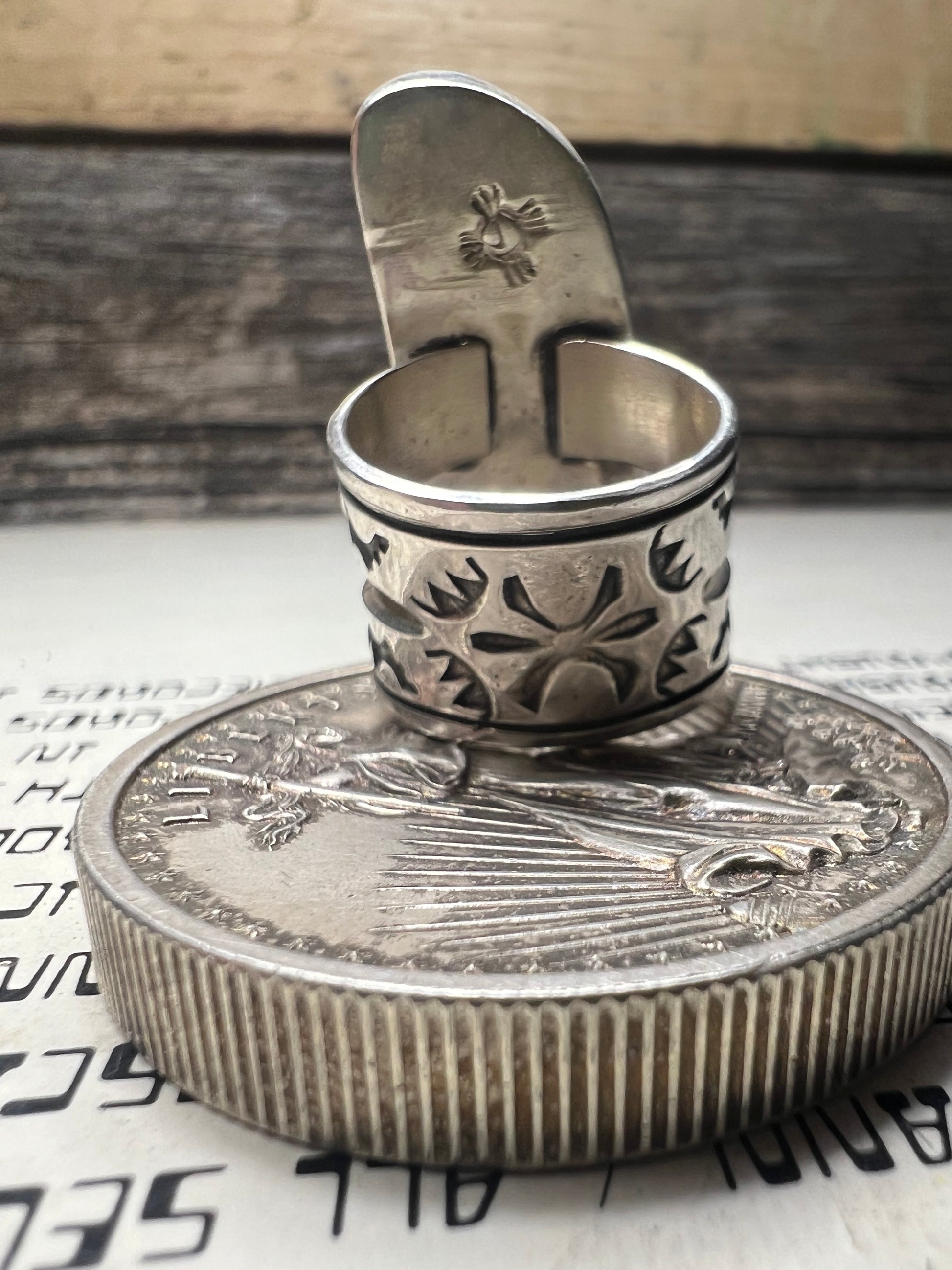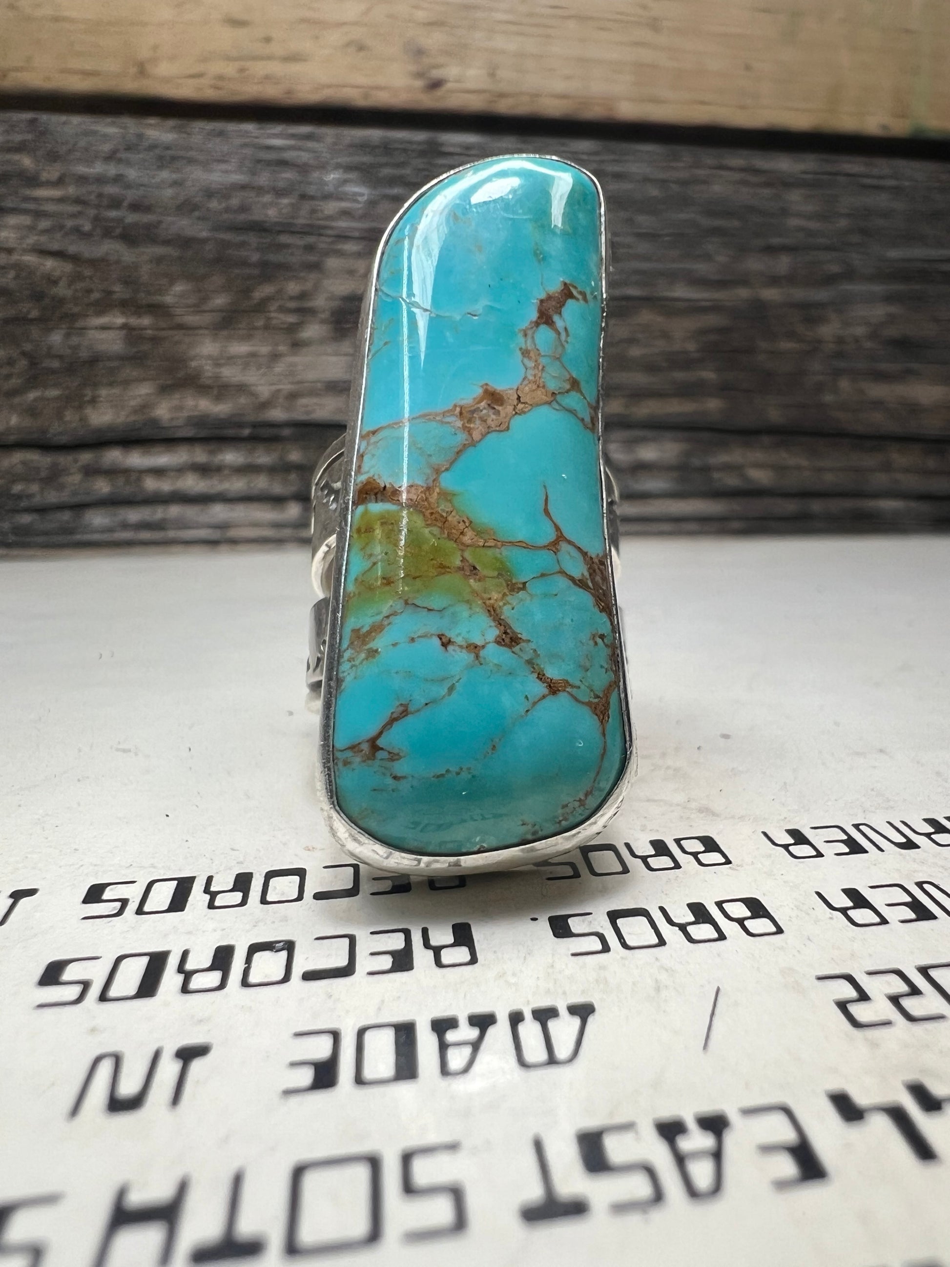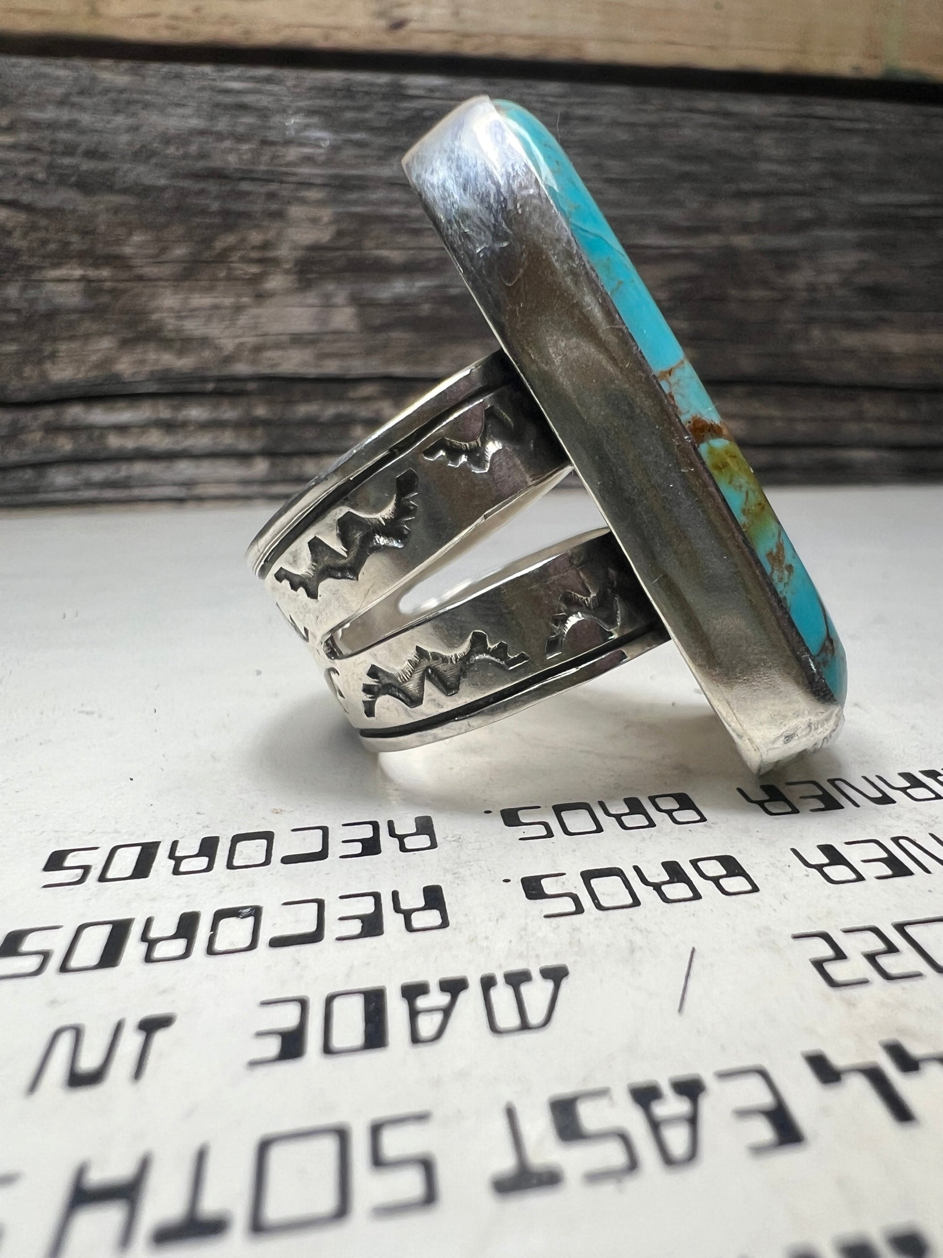 High grade Kingman turquoise set in fine and Sterling silver ring is a size 7 on hands stamped split band
