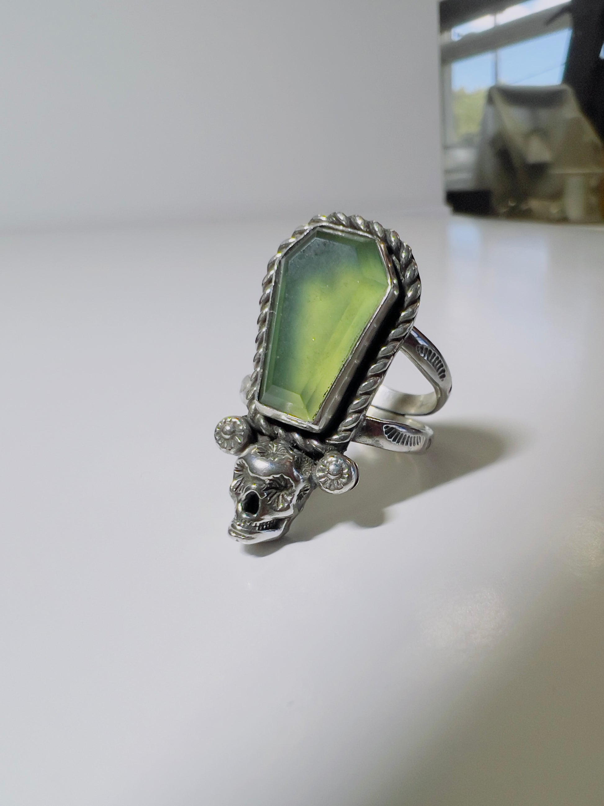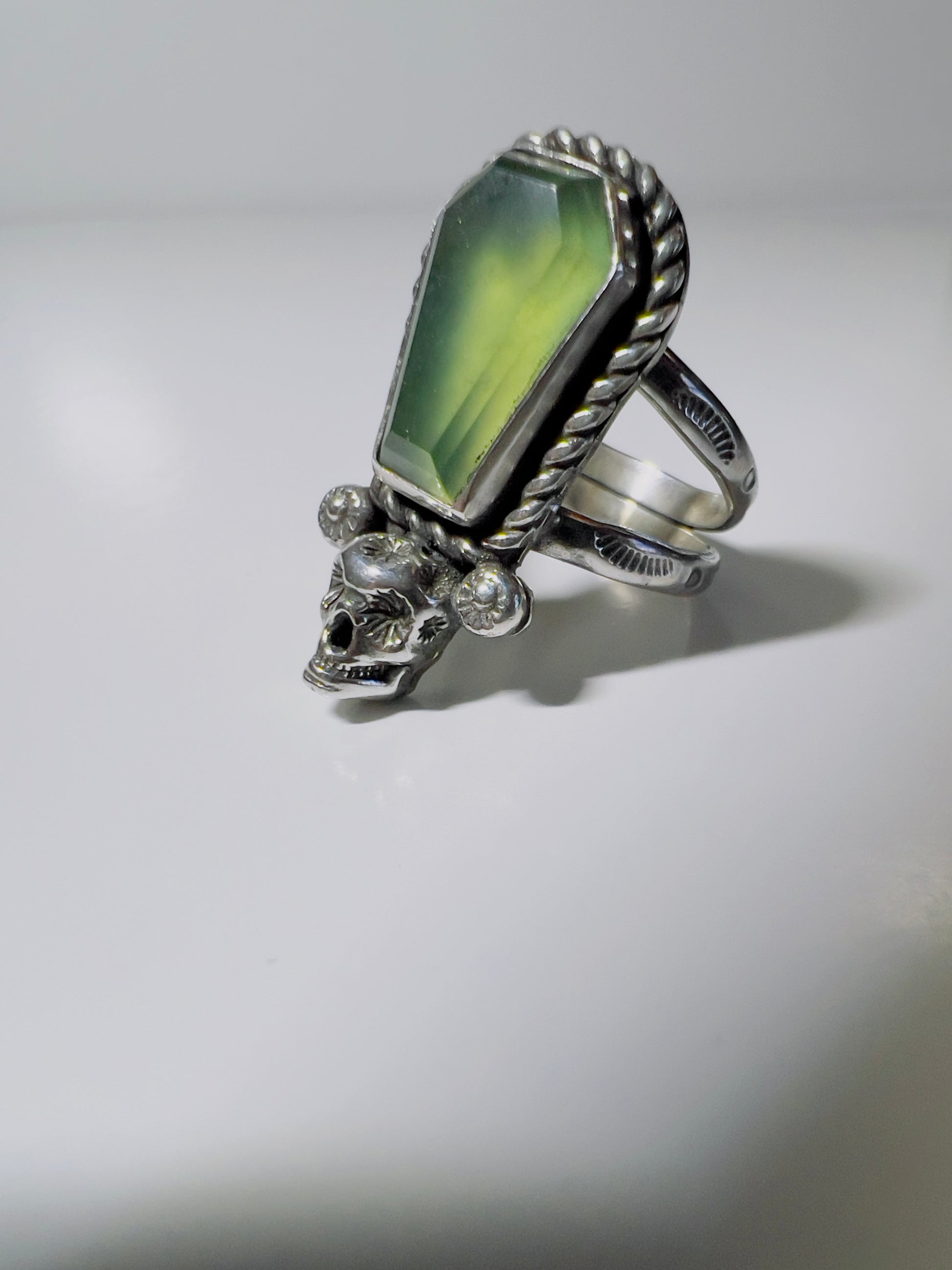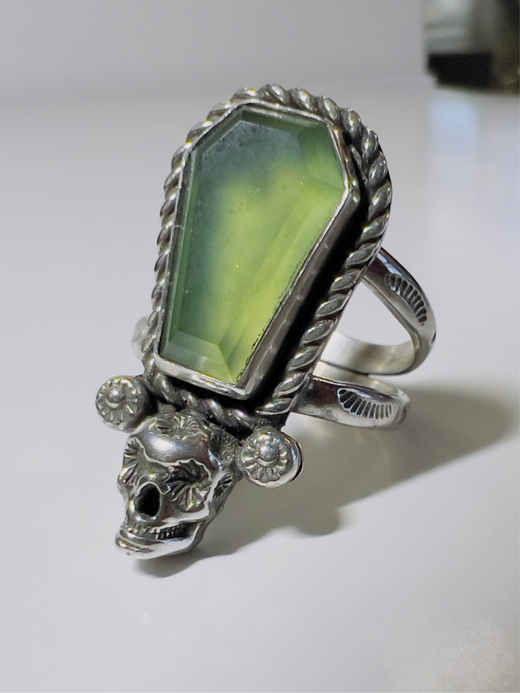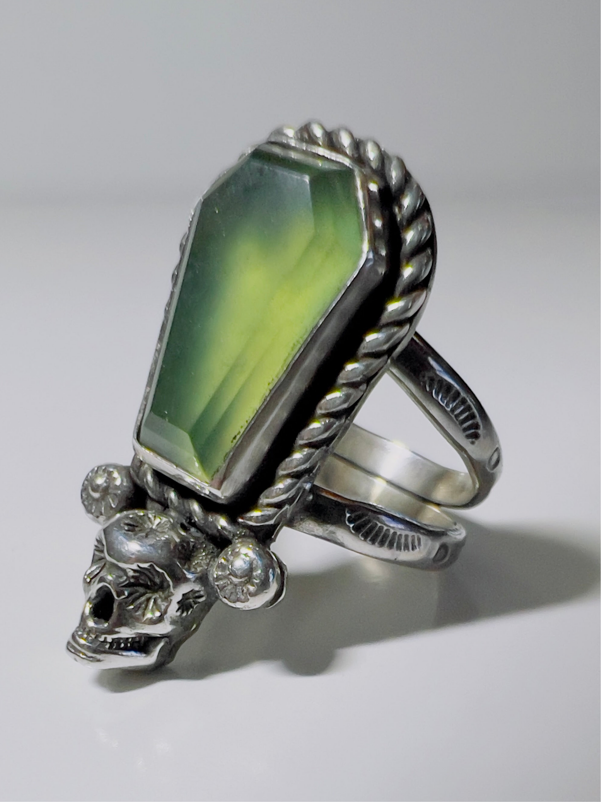 7.5 hand stamped band with sepentinite facet coffin set in sterling and fine silver