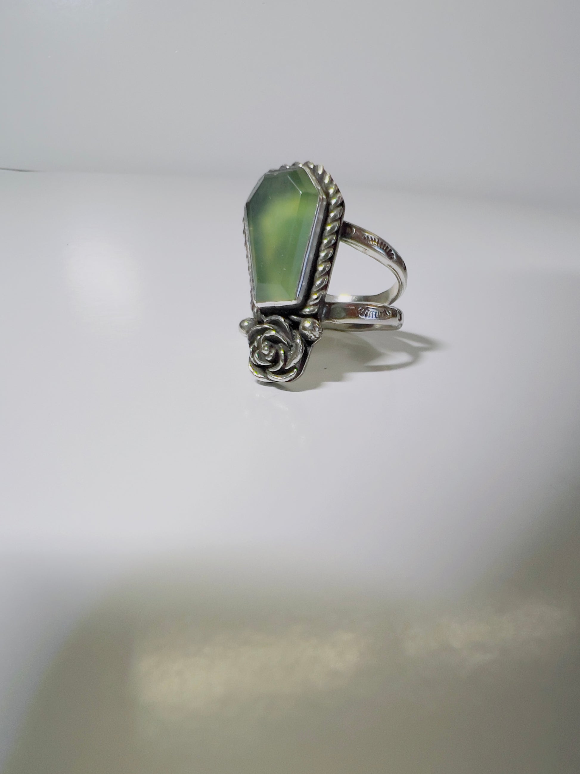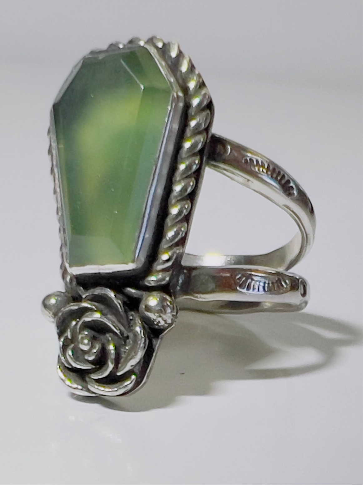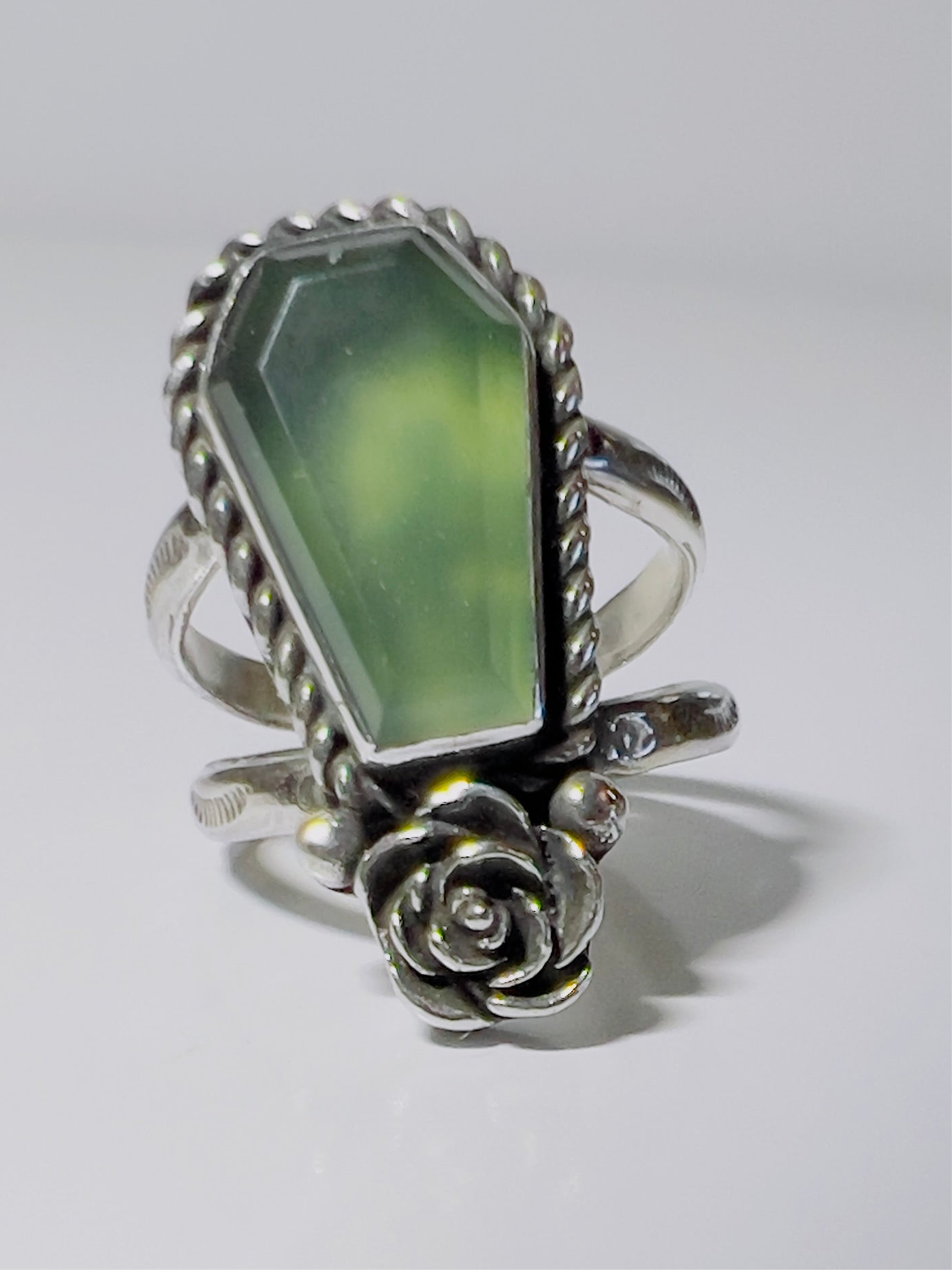 Size 8 hand stamped band with sepentinite facet coffin set in sterling and fine silver