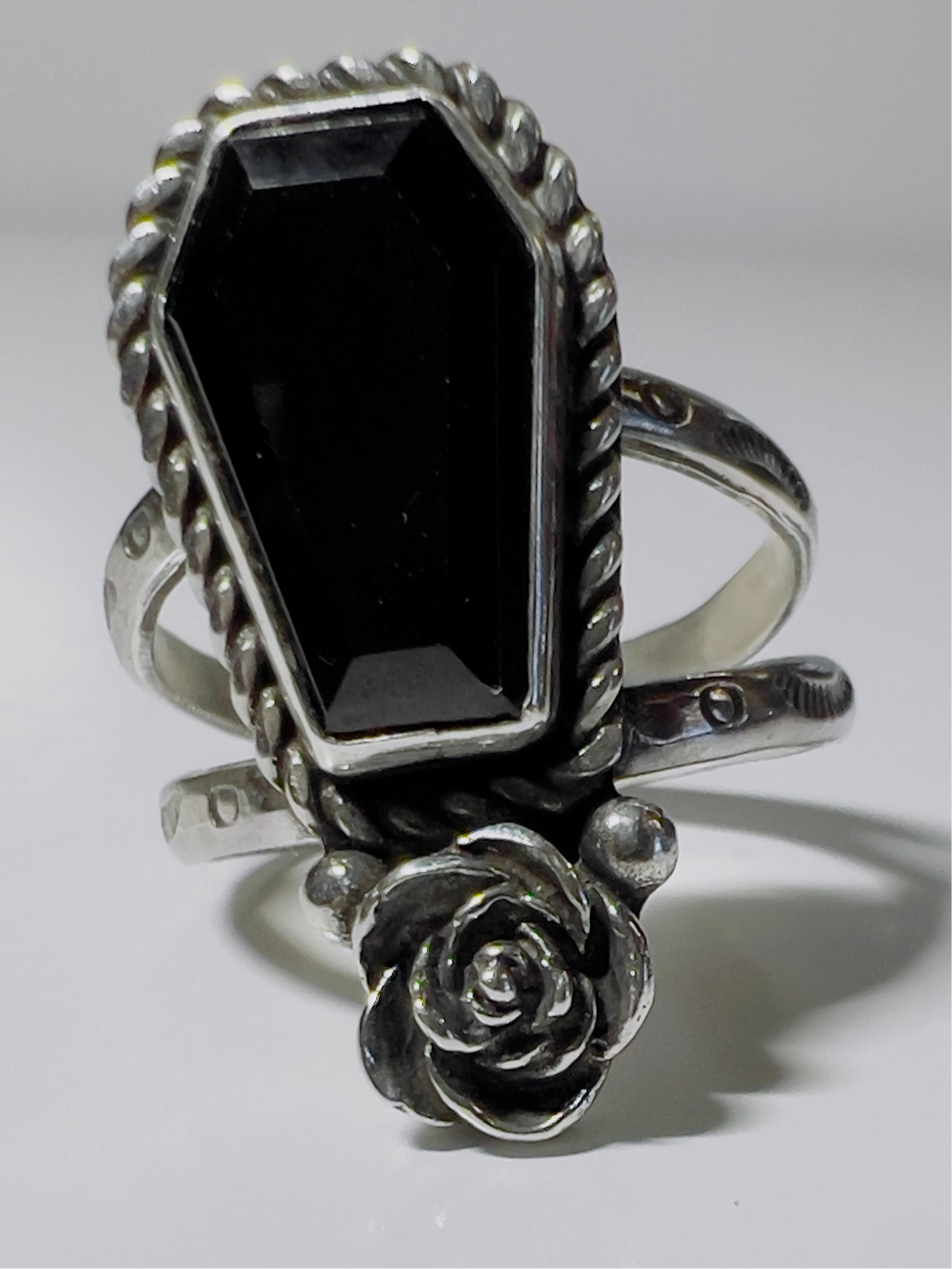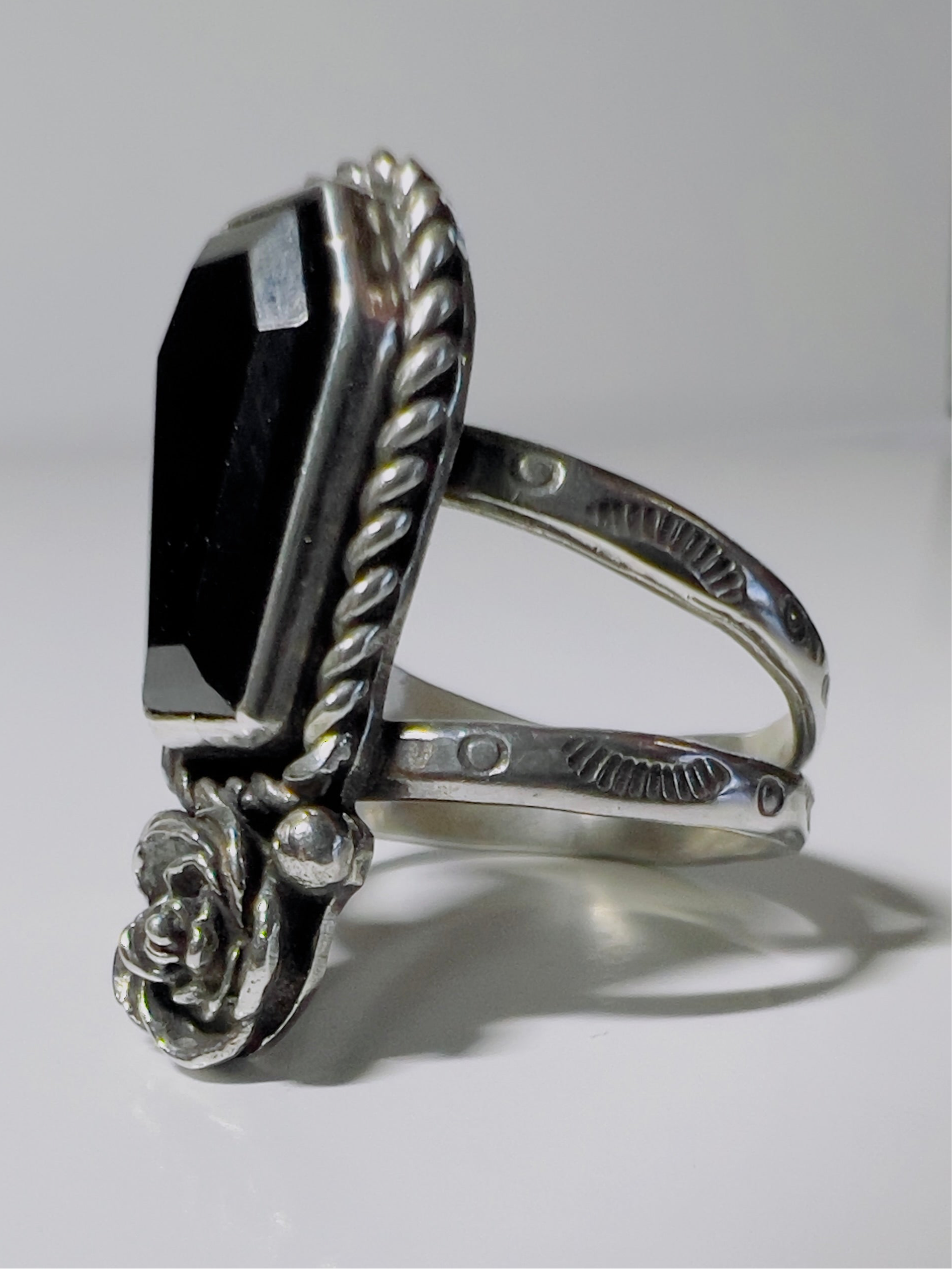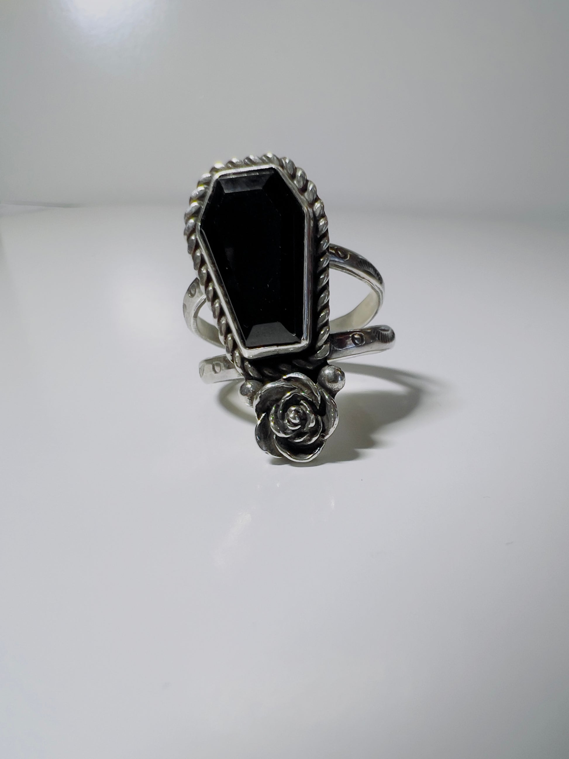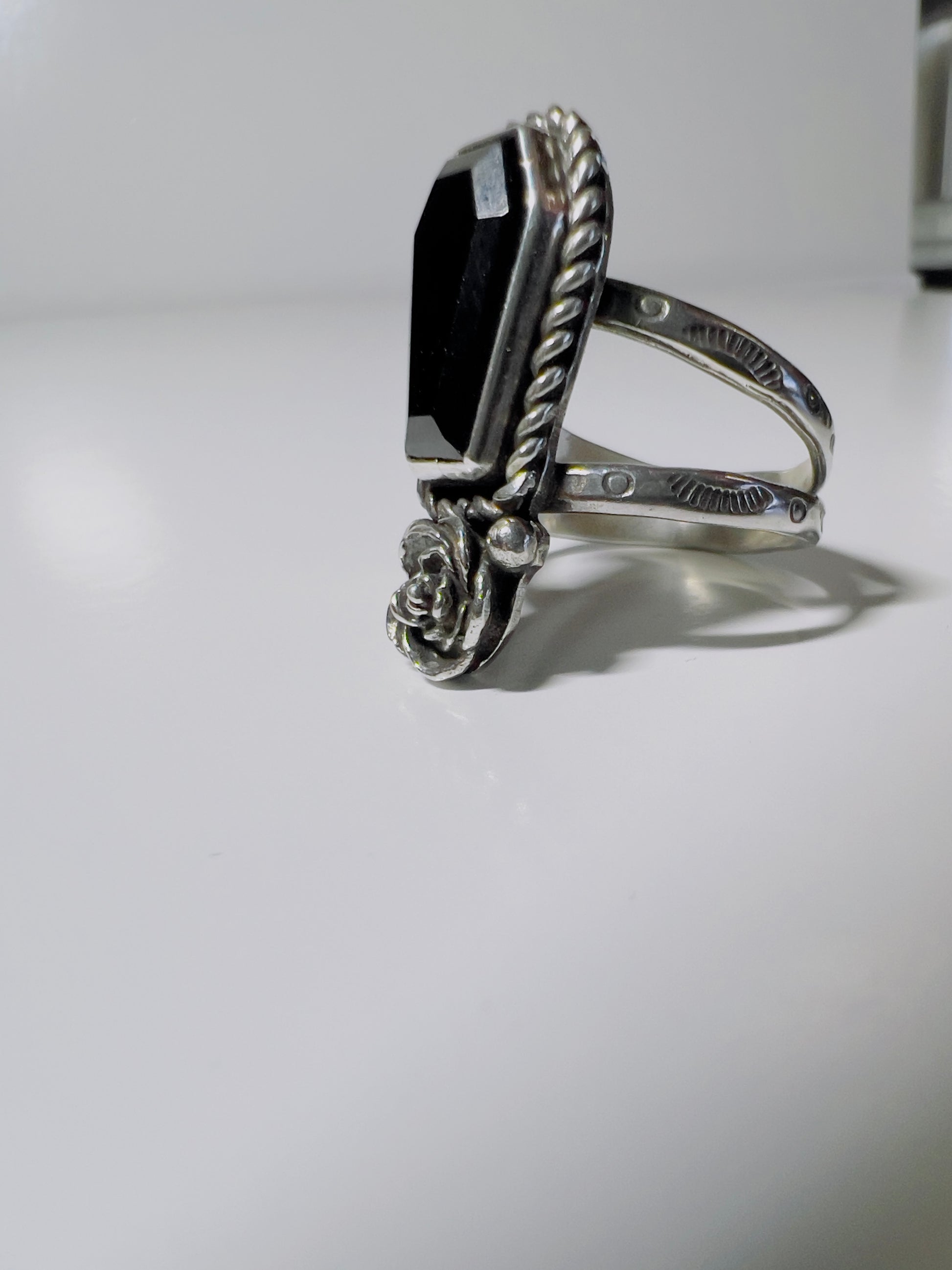 Size 9.5 hand stamped band with spinel facet coffin set in sterling and fine silver