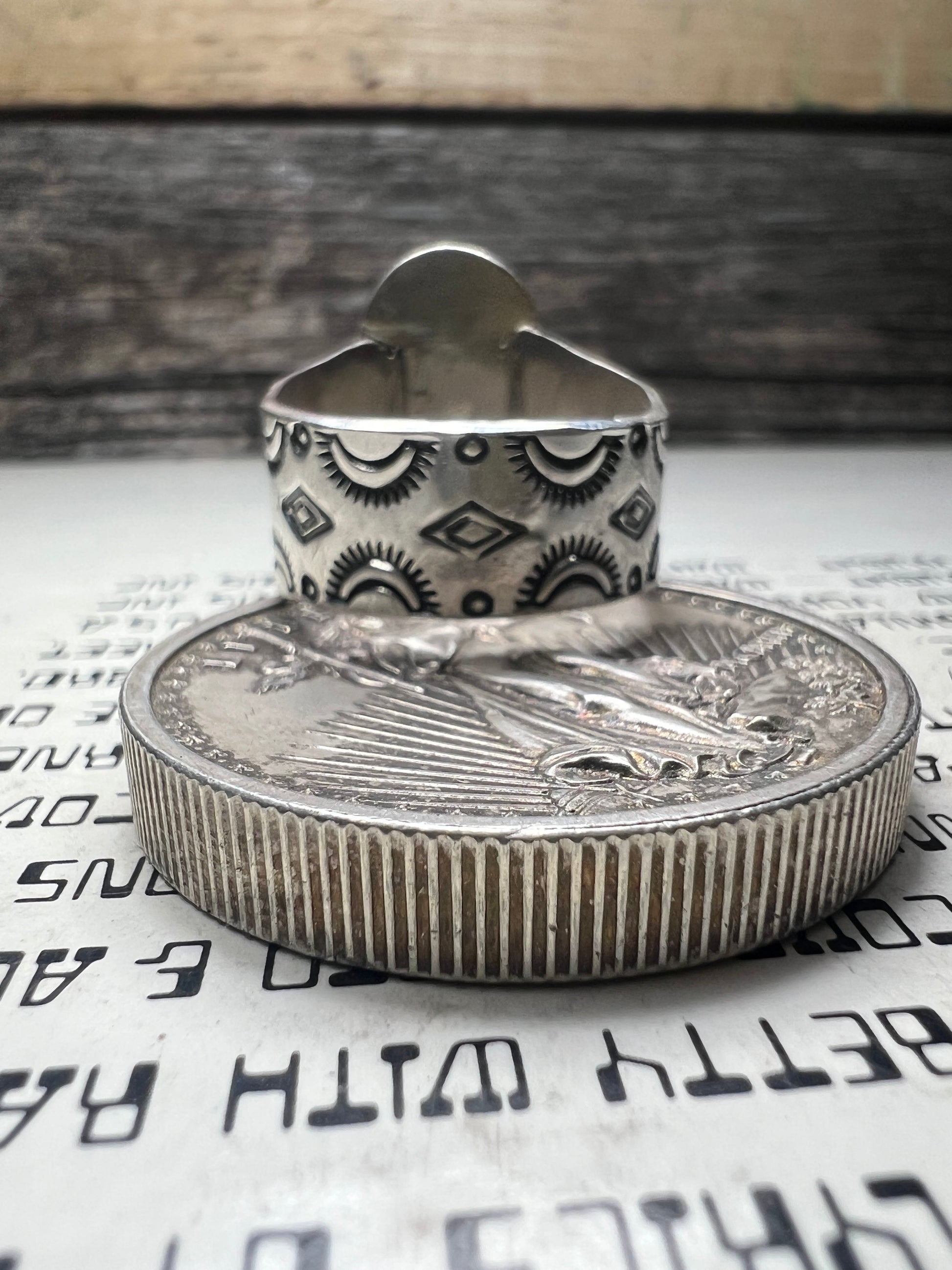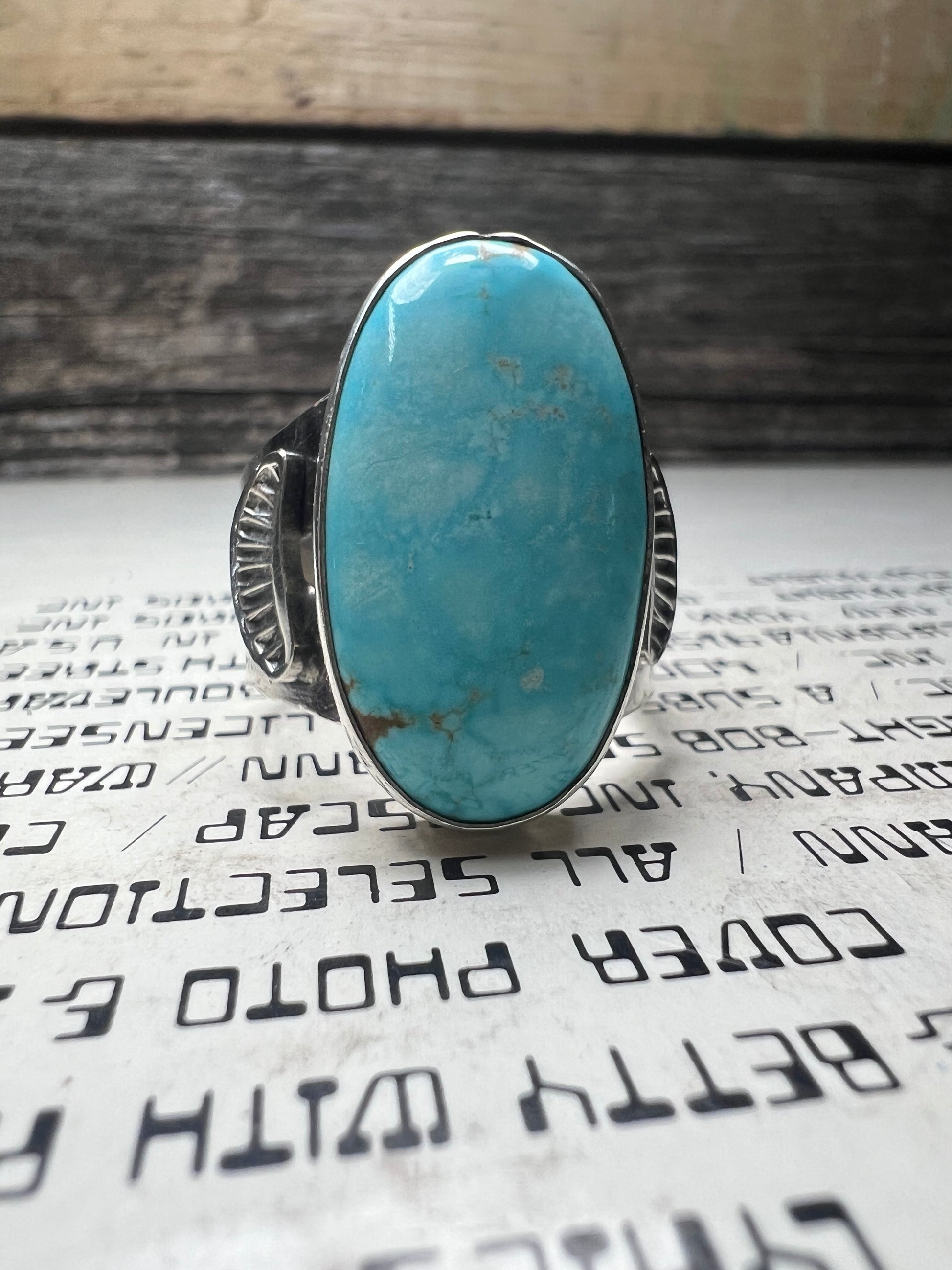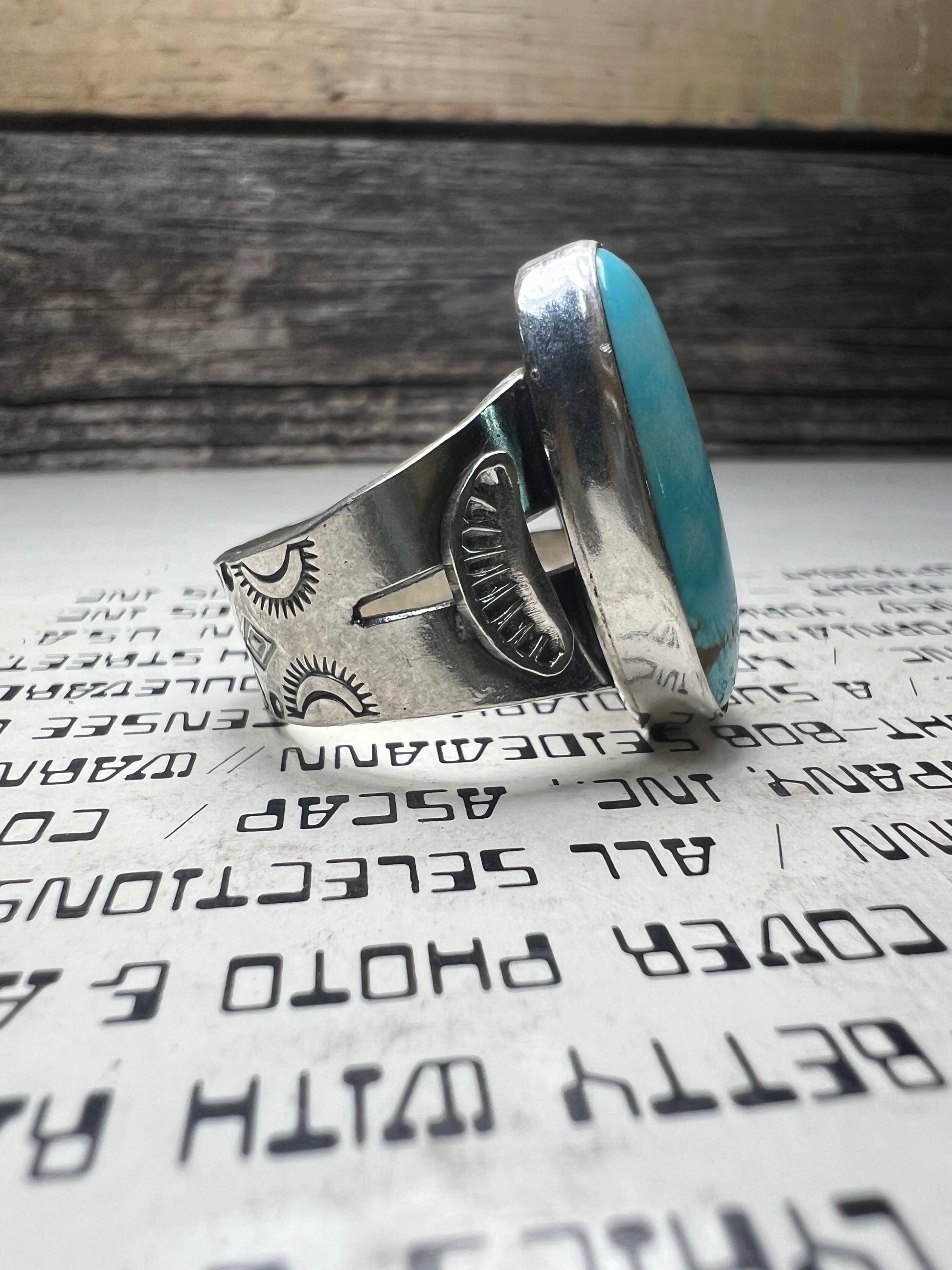 Size 12 1/2. High grade #8 mine turquoise set in Sterling and find Silver on Hand stamped sterling silver band
