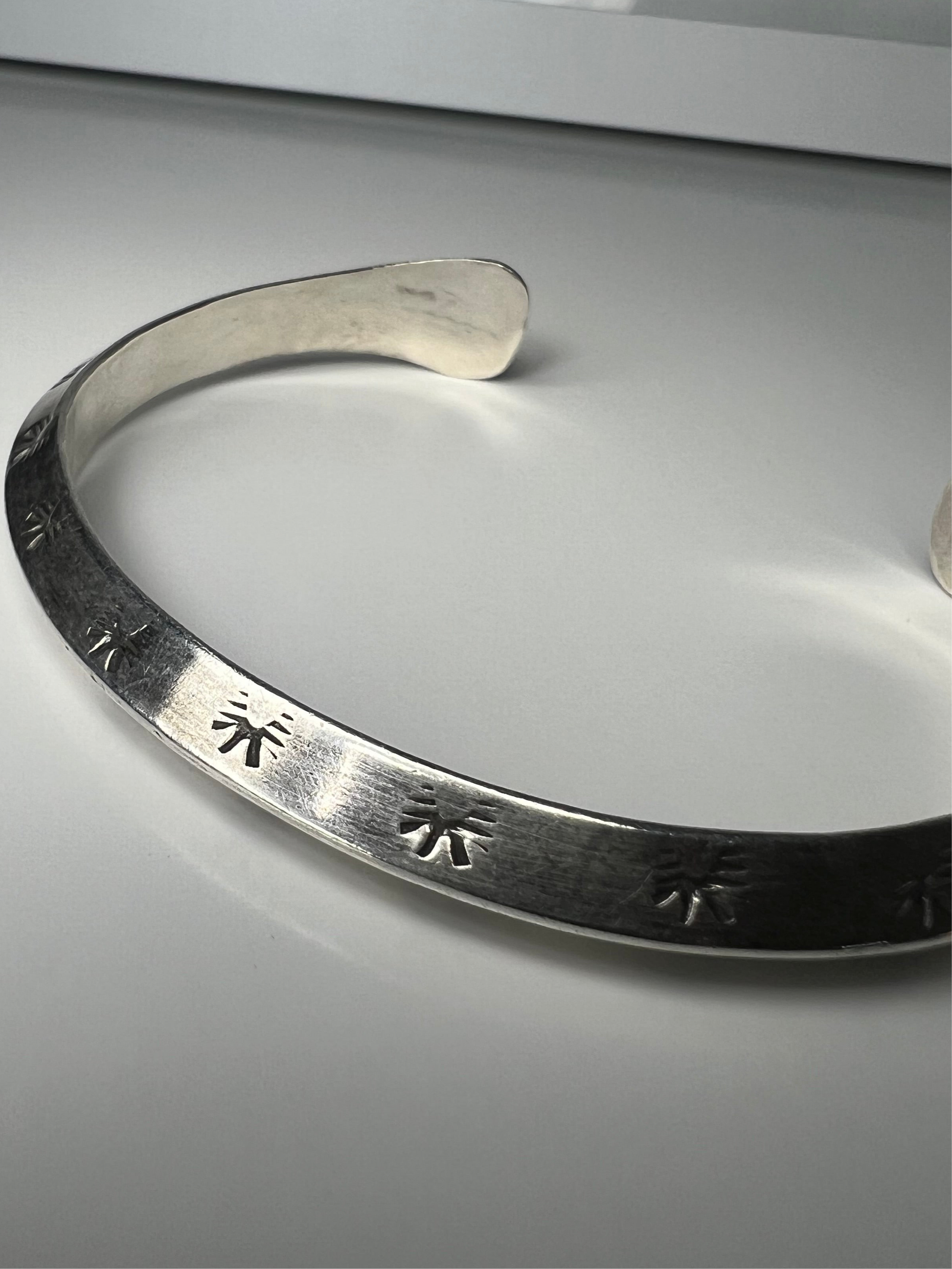 hand stamped solid sterling silver cuff with Kingman Turquoise ends.