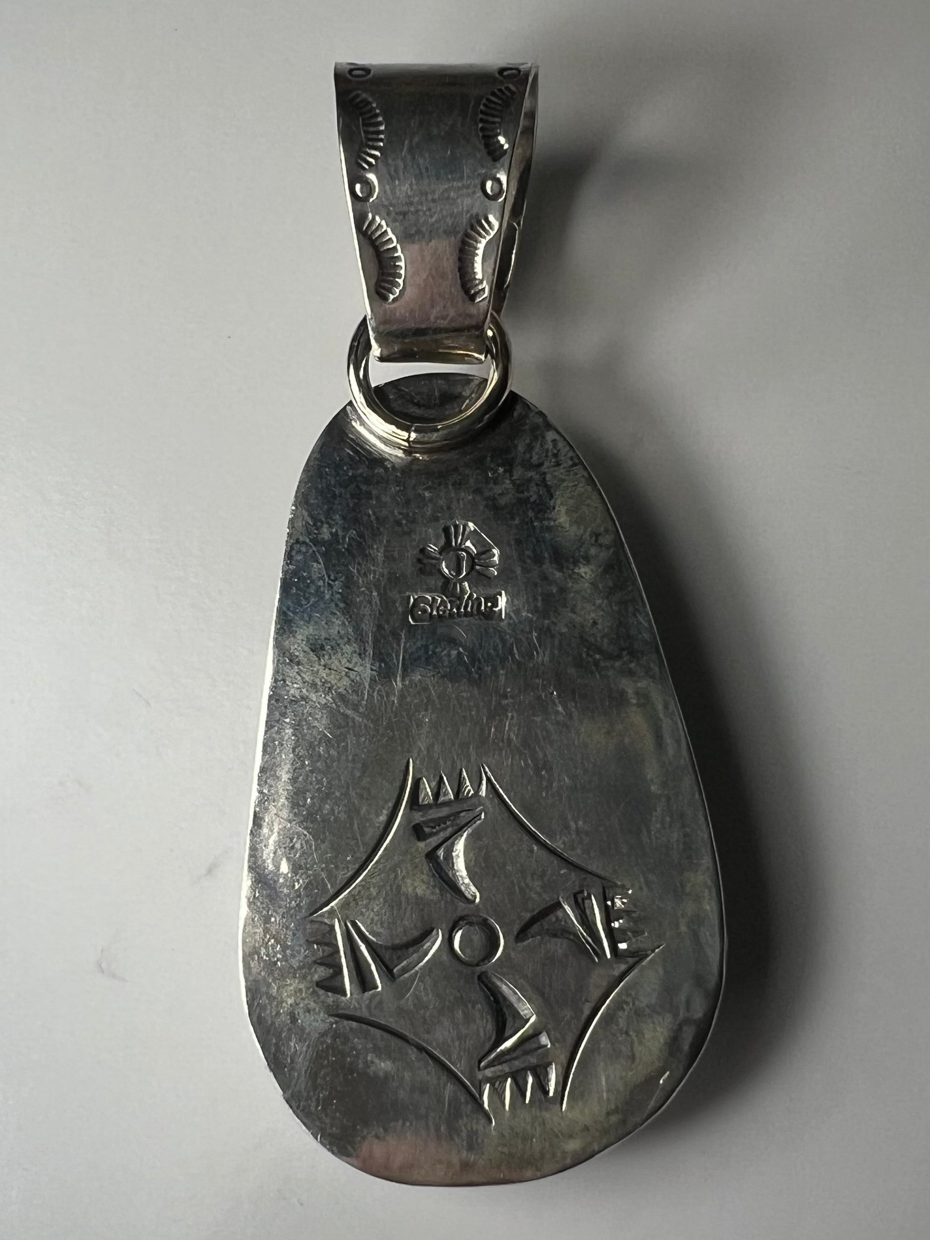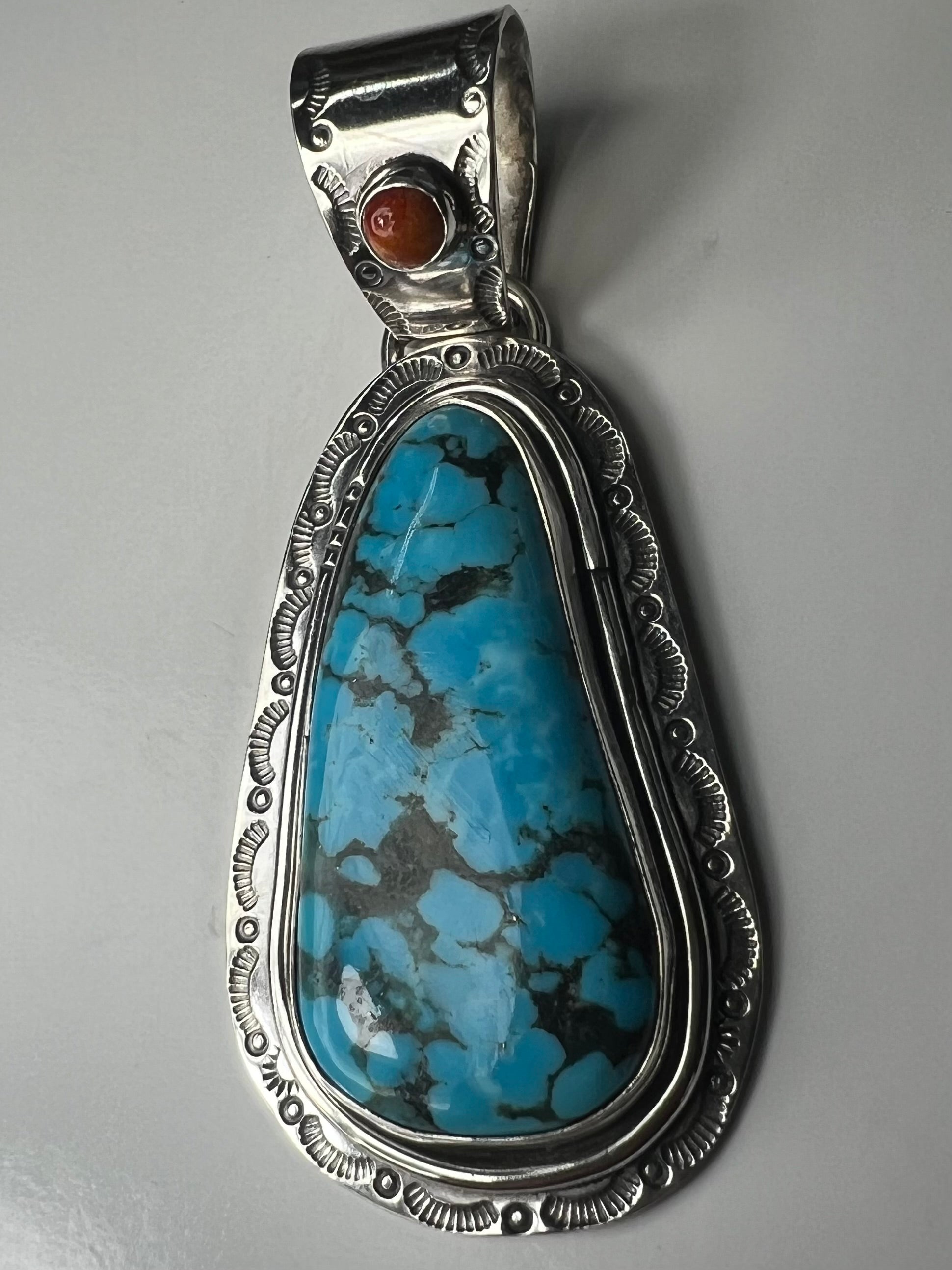 Very high-grade Kingman turquoise set in Sterling and find Silver hand stamped with coral on the bail. Measures 3 x 1 1/2 inches.